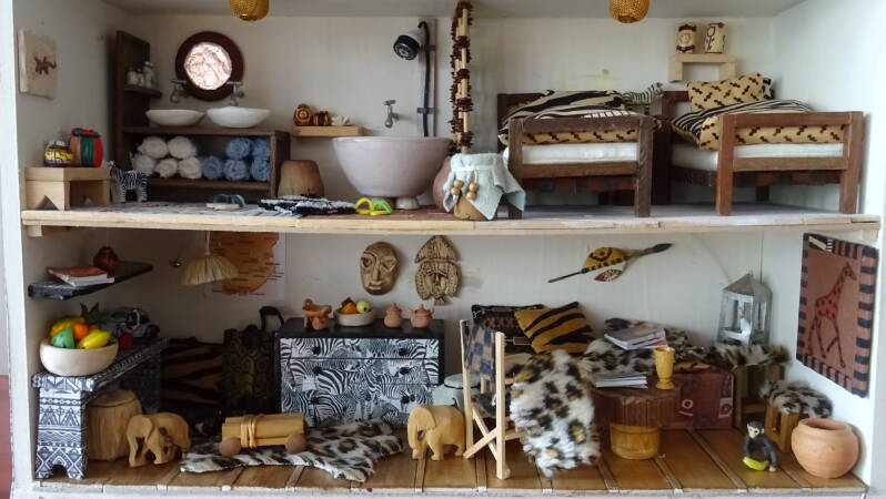 Een soort safarihut. Ook weer alles uit de rommeldozen. De trommels zijn kurken, het bad een pinda schaaltje, de meubels van restjes hout en de de poema deken was een sjaal van Trudy, ze knipte hem resoluut in tweeën want het poppenhuis gaat voor.
