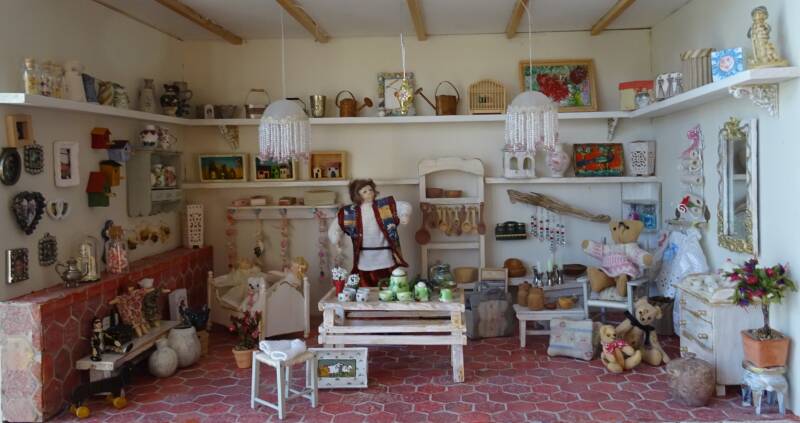 Mijn brocante winkeltje, ook weer leuk om te maken. Alles een beetje oud maken moet je ook leren. Er komen nog steeds dingetjes bij. De vloer is van eierdozen, zelf getekend en uitgeknipt. In de vakantie van vorig jaar heb ik allemaal potjes uit hout gesneden. Dat was nieuw voor me maar het lukte aardig dankzij tips van mijn zeer handige schoondochter. Ze gaf me ook een soort olie om de potjes mee af te werken en die werden daar heel mooi van. Daarna ben ik ook een heleboel lepels gaan snijden.
