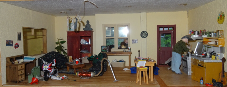 Ook dit is een idee uit Dollshousenederland. Het is een schilderij van Marius van Dokkum. Je kunt er uren naar kijken, zoveel details. Mijn kamer is niet precies nagemaakt omdat de ruimte anders was maar de sfeer is wel hetzelfde. Veel rommel en lekker slordig. Behalve de motor en het boedda beeld is alles van karton, oude houtjes en dingen uit de "prulariabak" gemaakt.