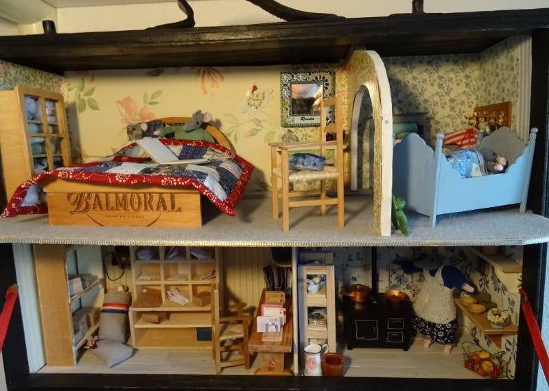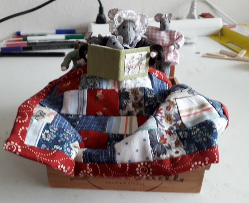 Een nieuw project, dit is een houten koffertje. Het was mijn eerste muizenhuisje maar ik vond het niet zo mooi. Dus alles er uit en opnieuw begonnen. Het is klein dus ging het wel snel. Nu nog een paar muizen erbij.