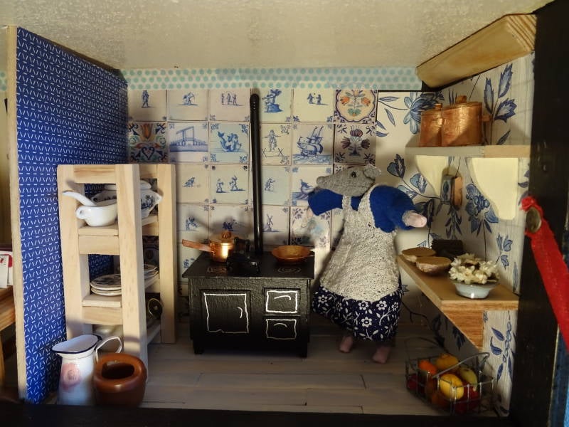 In de keuken allerlei restjes behang en stickers, het fornuis is van karton en de pannen ook.