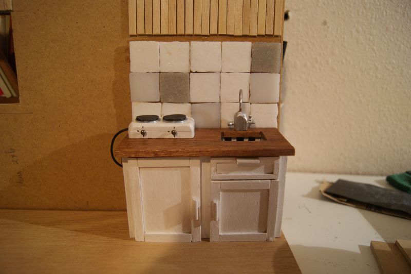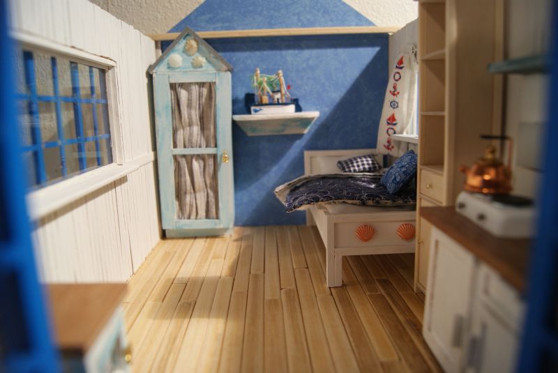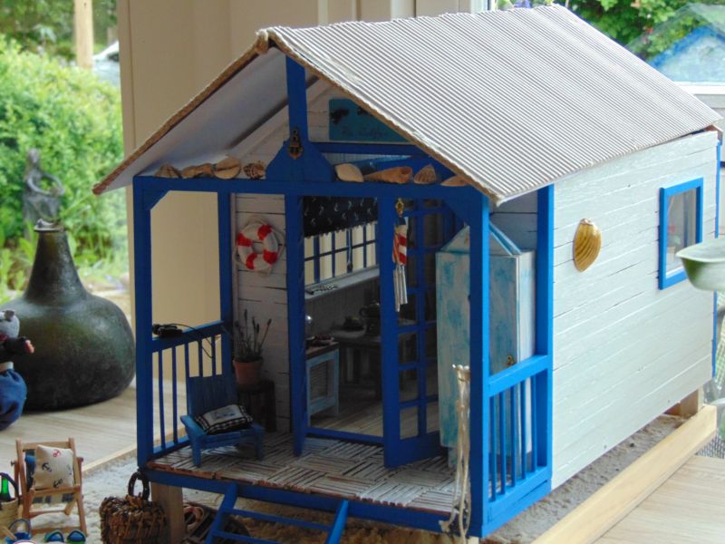 Het strandhuisje is een nieuw werkstuk. Van allerlei restjes hout is het huisje gezaagd. Het keukentje ook. Kookstel is van hout en twee ringetjes. De kraan van koperdraad, tandenstokers en een paar mooie knopjes, die kreeg ik van een vriend. Hij had ze over van een bootje.